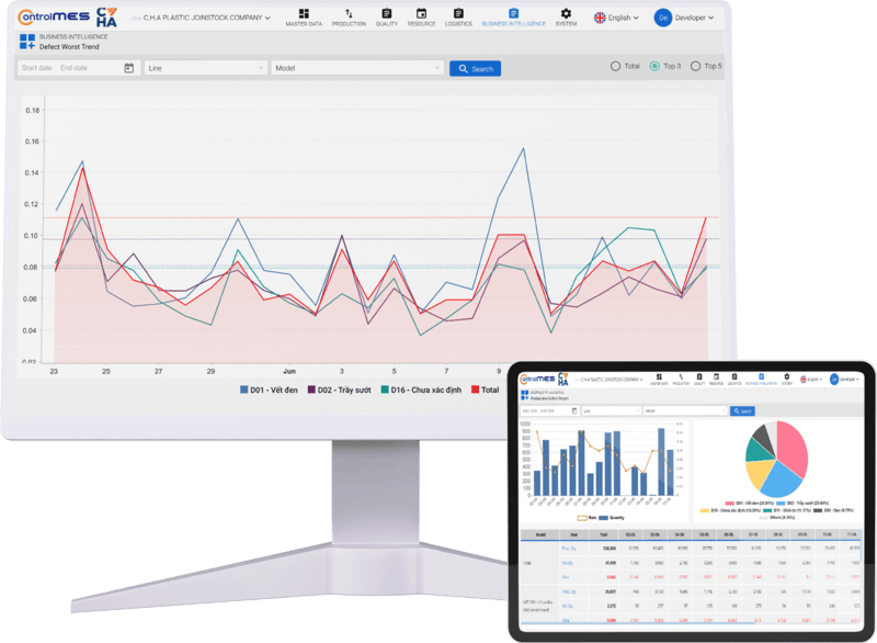 The “brain” of ControlMES — turning real-time production data into clear, actionable insights. Get a bird’s-eye view of the entire factory while drilling into every bottleneck in detail.